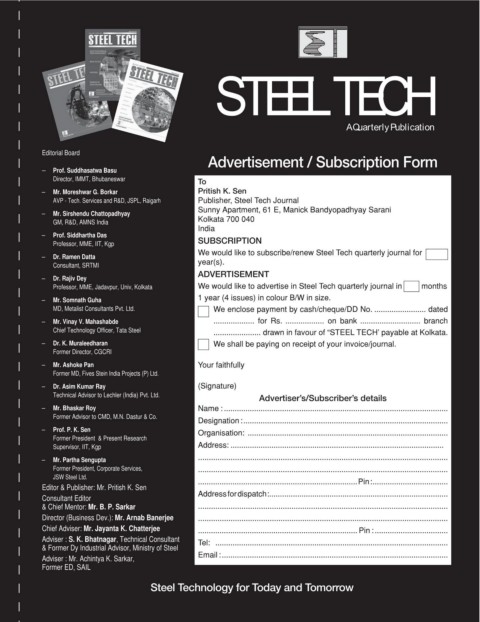 Professor, MME, Jadavpur, Univ, Kolkata :H ZRXOG OLNH WR DGYHUWLVH LQ 6WHHO 7HFK TXDUWHUO\ MRXUQDO LQ PRQWKV