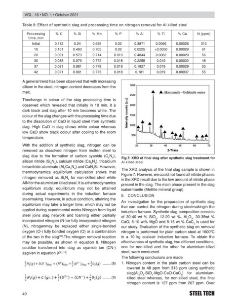 Table 8: Effect of synthetic slag and processing time on nitrogen removal for Al killed steel