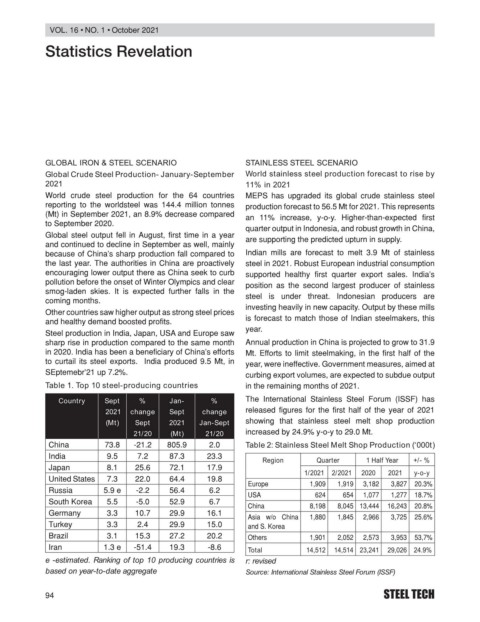 (Mt) Sept 2021 Jan-Sept VKRZLQJ WKDW VWDLQOHVV VWHHO PHOW VKRS SURGXFWLRQ