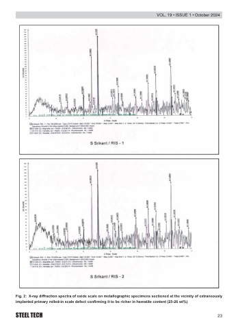92/ Ć ,668( Ć 2FWREHU )LJ ; UD\ GLႇUDFWLRQ VSHFWUD RI R[LGH VFDOH RQ PHWDOORJUDSKLF VSHFLPHQV VHFWLRQHG DW WKH YLFLQLW\ RI H[WUDQHRXVO\ LPSODQWHG SULPDU\ UROOHG LQ VFDOH GHIHFW FRQ¿UPLQJ LW WR EH ULFKHU LQ KHPDWLWH FRQWHQW ZW STEEL TECH